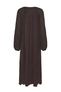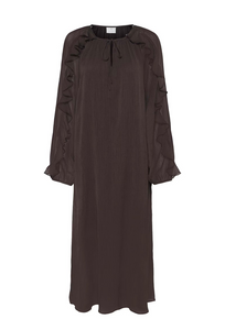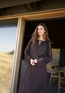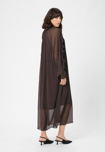 Langes Kleid mit transparenter, leichter Struktur, lockerer Passform und hohem Ausschnitt. Raglanärmel mit Rüschen und zartem Bindeband.