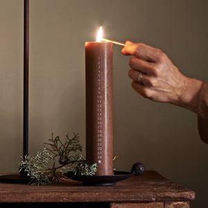 Schöne Adventskalenderkerze im angesagten Braunton mit Zahlen von 1-24.