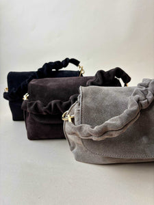 Schöne Handtasche aus Wildleder mit raffinierten Details und zwei Bändern, zum kurzen und langem Tragen der Handtasche.