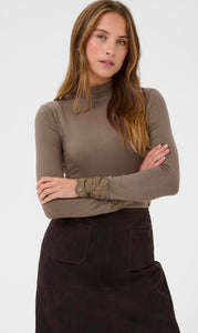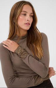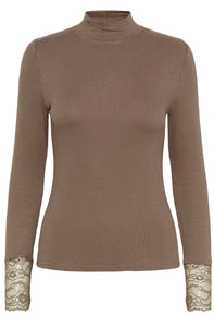 Geripptes Langarmshirt mit Stehkragen und zarten Spitzenabschlüssen an den Ärmeln. Komfortable, figurbetonte Passform für vielseitige Looks.